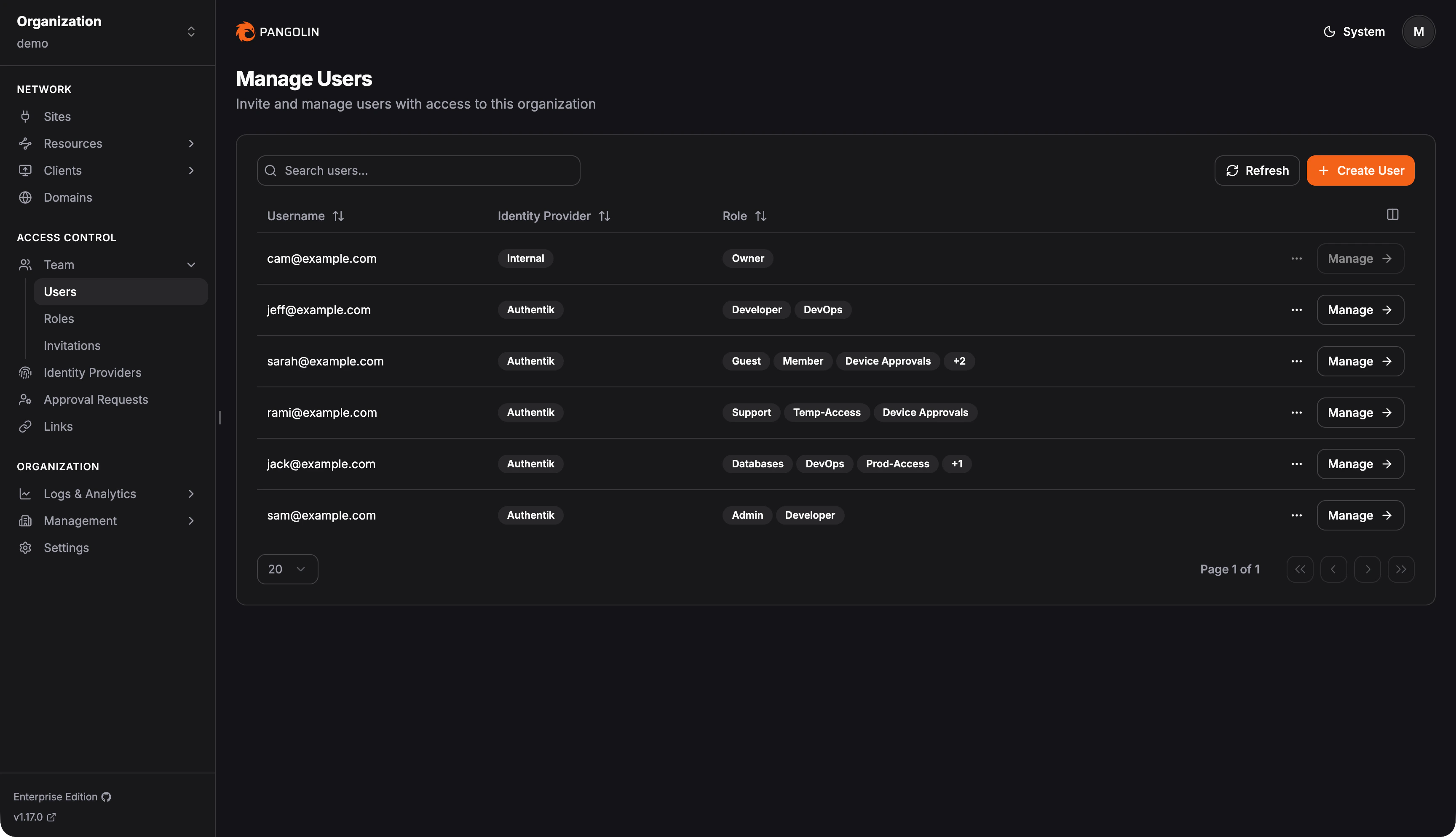 An external user is an identity managed by an external identity provider. When creating an external user, you will need to select an existing identity provider added to Pangolin. Check out the documentation on adding an IDP. An identity provider may have auto‑provisioning enabled. This means new users who log in with the IDP are automatically created and you do not need to manually create the user. Check out the auto‑provisioning documentation. Even if auto‑provisioning is enabled, you can still manually create users.Roles