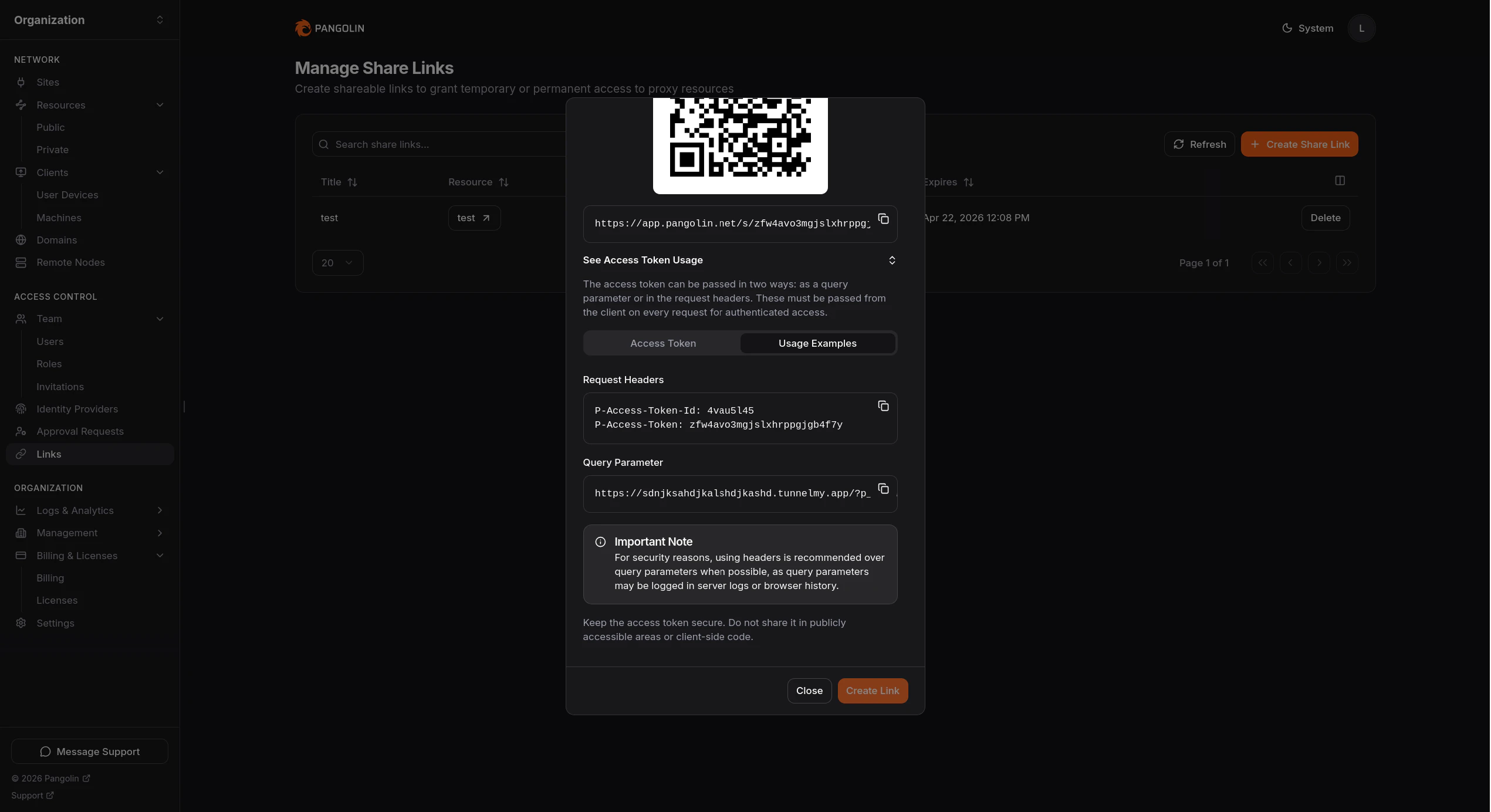 Pangolin can accept a Link access token in either the query string or request headers. If you are sending access to a person, use the copied Link shown at the top of the modal. Use Access Token Usage only when you are calling the resource URL directly on each request. This is why the two URLs often look different:- The Link is usually on your Pangolin domain.