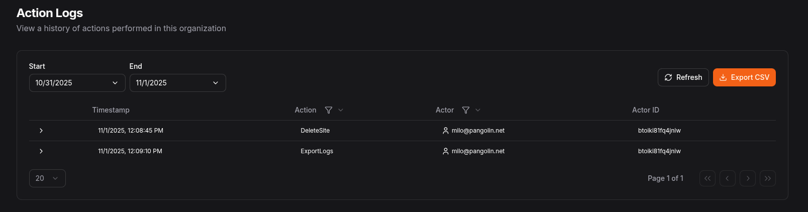 Action logs capture administrative events and configuration changes performed by users or API keys in the Pangolin dashboard. They record management operations such as creating resources, modifying settings, managing users, and other organizational changes. These logs are useful for:- Maintaining an audit trail of configuration changes