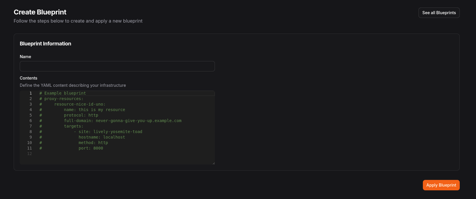 You can also apply blueprints directly in the Pangolin UI. Navigate to Settings > Blueprints and paste your YAML configuration into the provided text area.