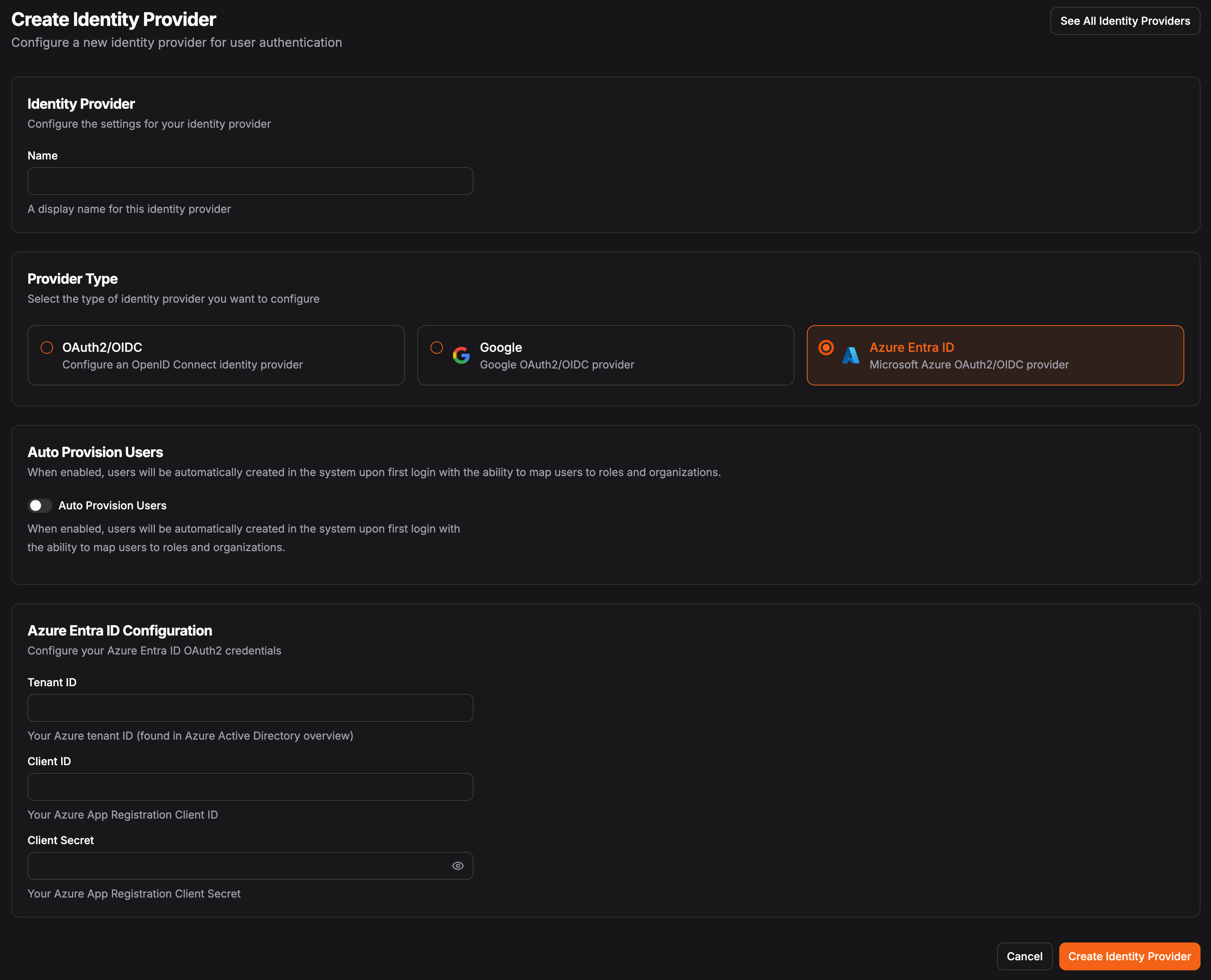 Select the type of identity provider you want to add (OAuth2/OIDC, Google, Azure Entra ID).