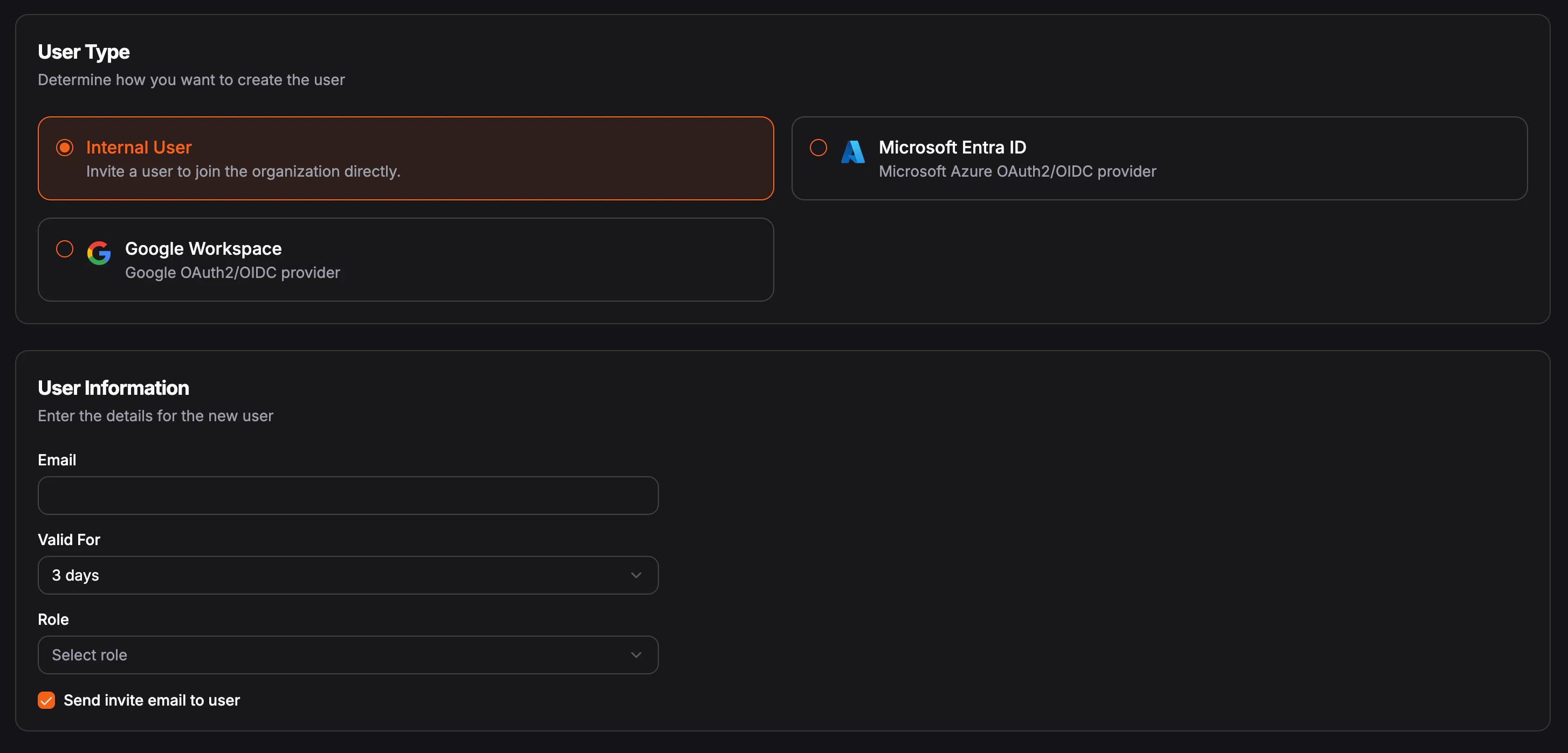 If auto provision is disabled, organization admins will need to manually create the user accounts and select the role for each user. When creating a user, you can select the identity provider that the user will be associated with. A user will not be able to log in using the identity provider if a user is not pre-provisioned in the system.