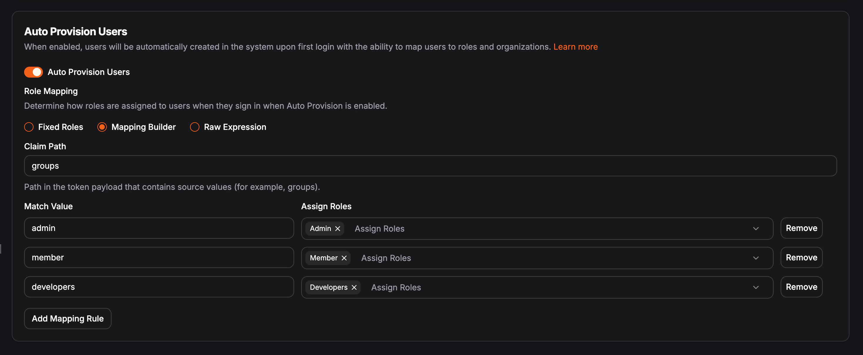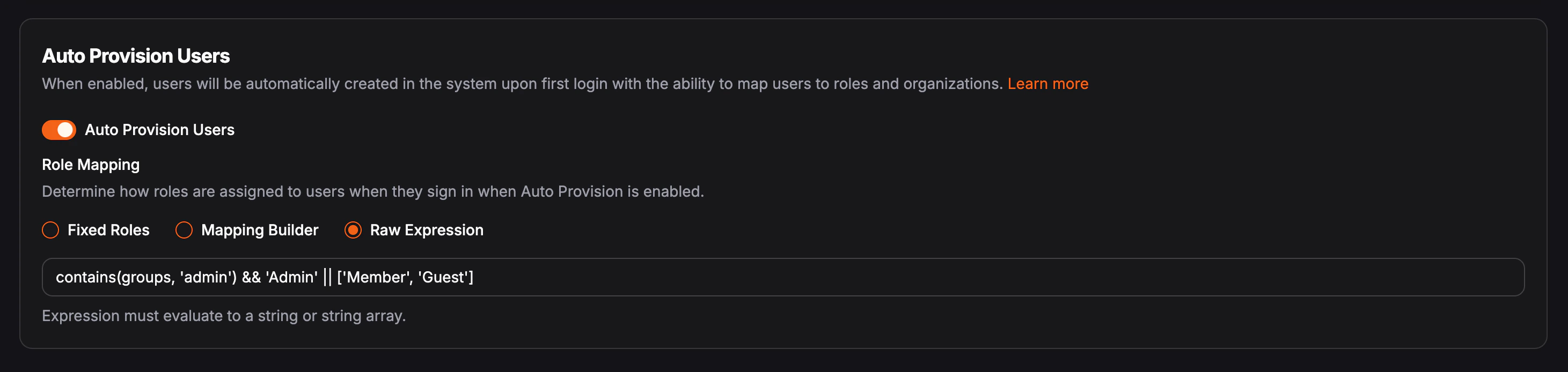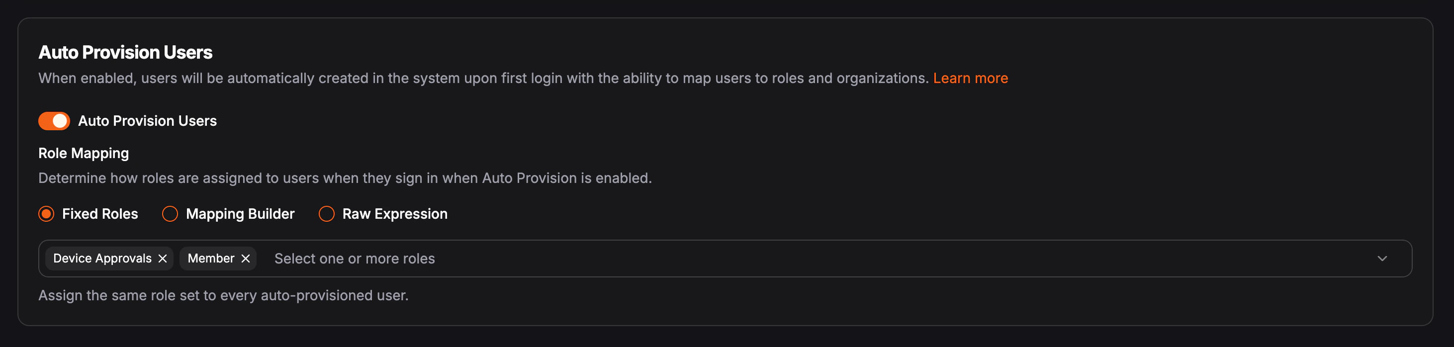 When you configure role mappings in auto provisioning settings, you use one of three approaches: fixed roles, mapping builder, or raw expression. These options are available for global identity providers and for organization-only identity providers.Auto provisioning does not create roles in Pangolin. Every role you assign whether you pick fixed roles, map IdP values in the builder, or return names from a raw expression must already exist in the target organization, and the name you use must match that role’s name exactly (character-for-character). This one-to-one name match applies to all three mapping types. If a name does not match an existing role, the user will not receive that role (and may not be added to the organization, depending on your setup).
