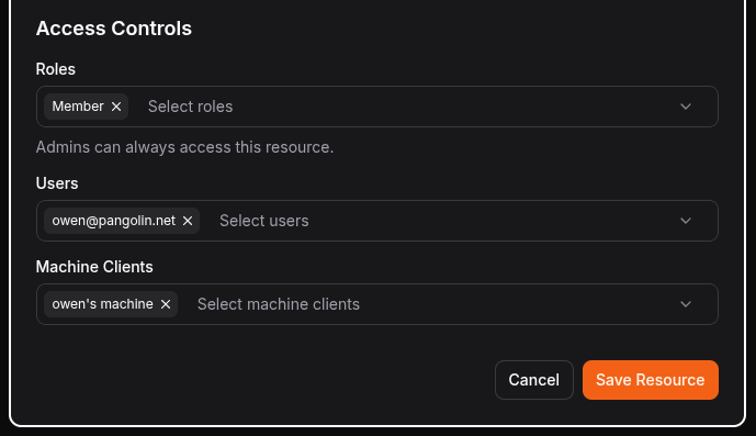 - Roles: Assign access to Resources to specific roles. Any user or machine with that role will gain access to the Resource when they connect.